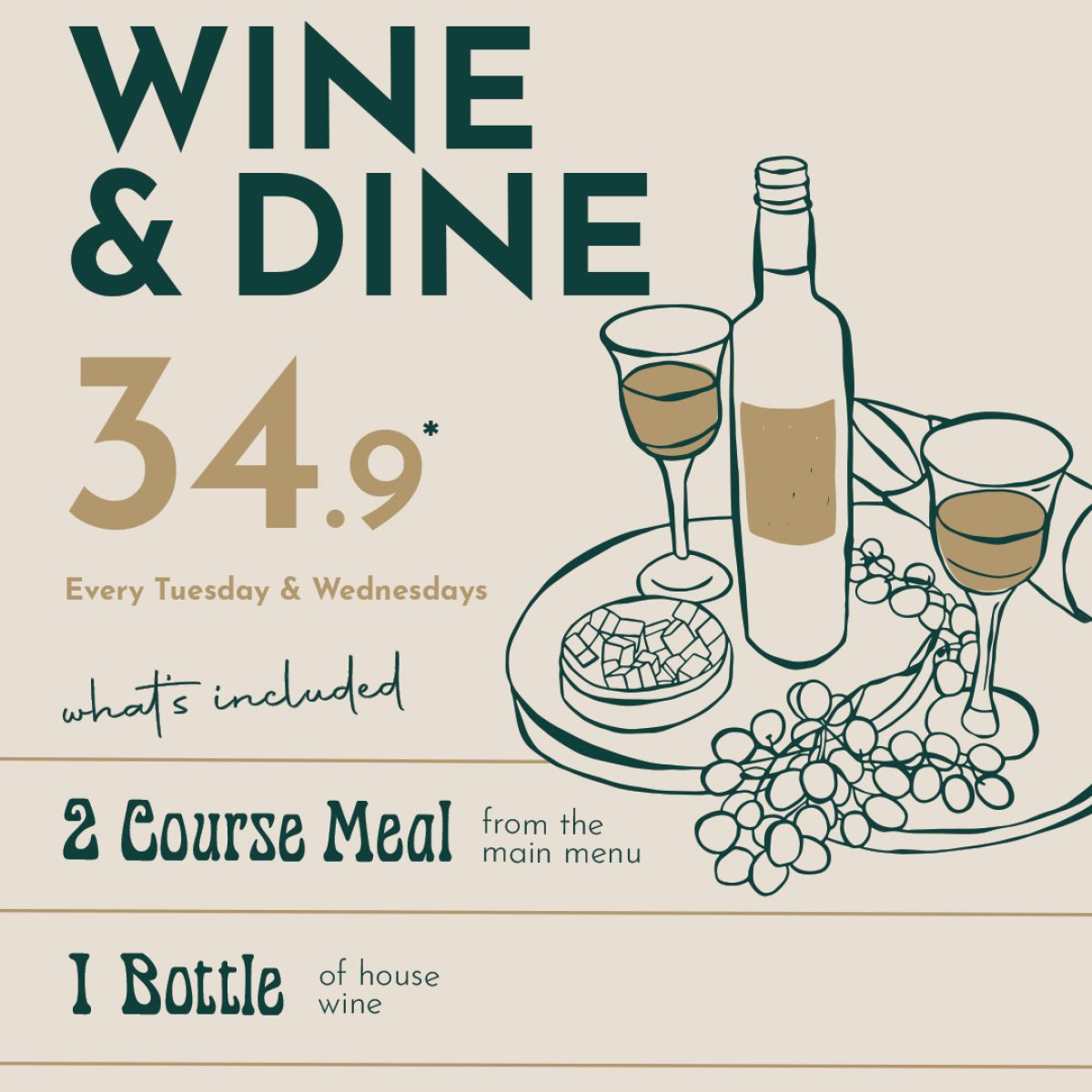 Two courses from our main menu plus one bottle of house wine per person